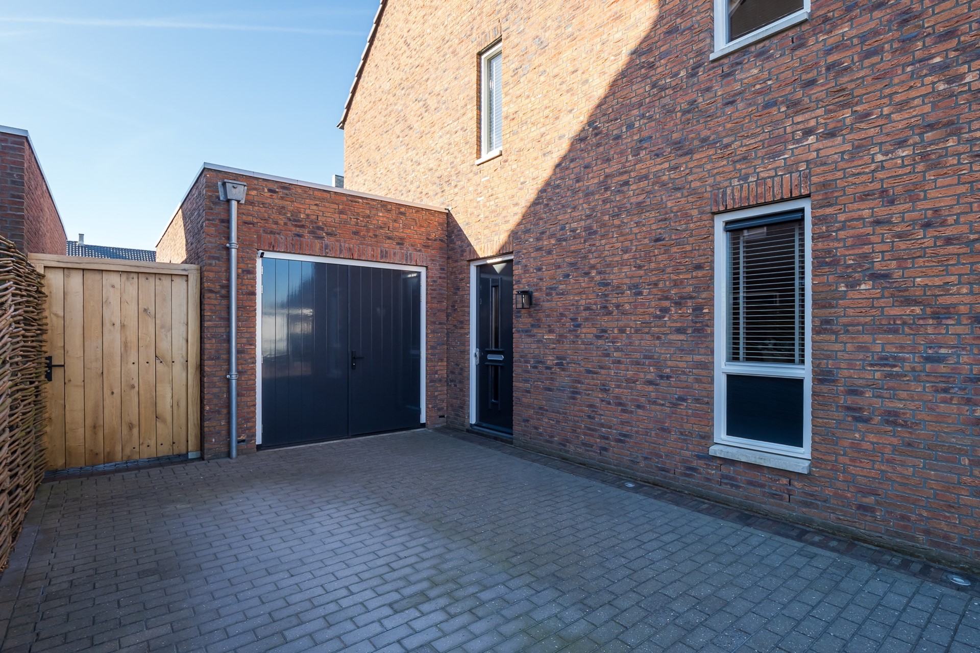 De voortuin is verzorgd aangelegd met pebblegrind, wat zorgt voor een rustige en stijlvolle uitstraling. De oprit met klinkerbestrating biedt ruimte voor twee auto’s en maakt het eenvoudig om een laadpunt voor een elektrische auto te realiseren. Grondspots langs de oprit en gevelverlichting bij de entree en tegen de zijgevel van de garage zorgen daarbij voor een sfeervol verlichte aankomst. De brede eikenhouten poort geeft toegang tot het pad dat je, langs de garage, naar de achtertuin leidt.