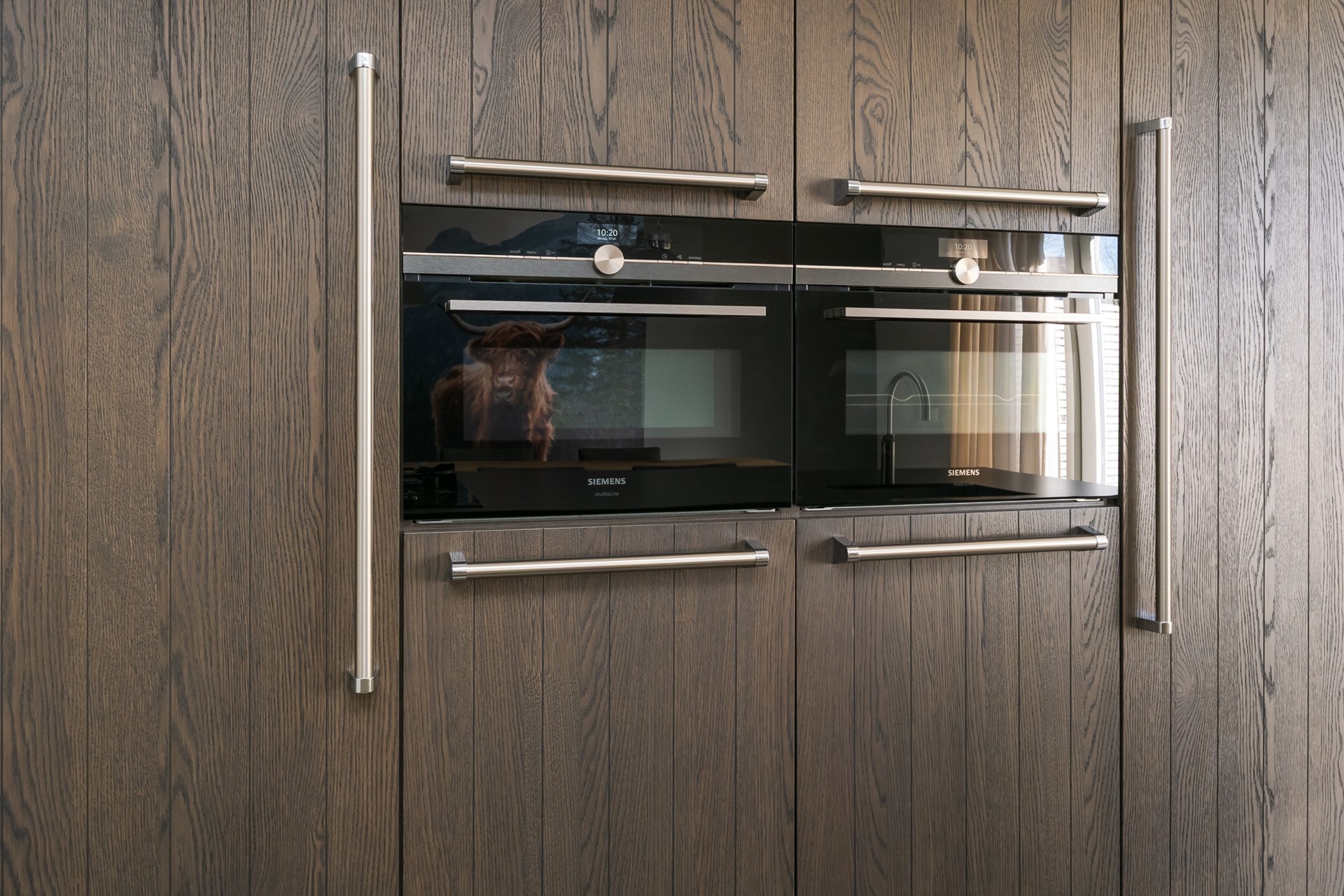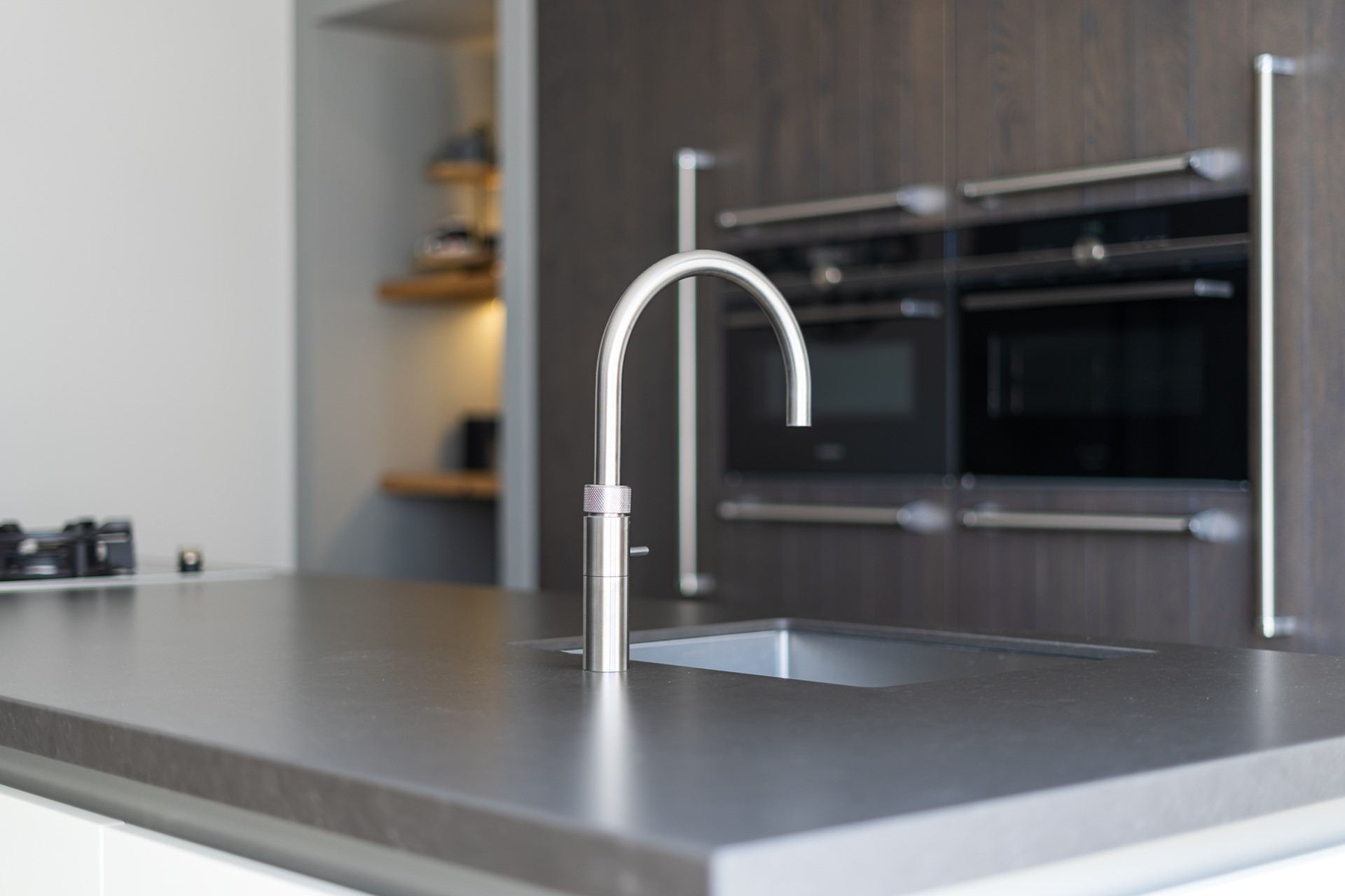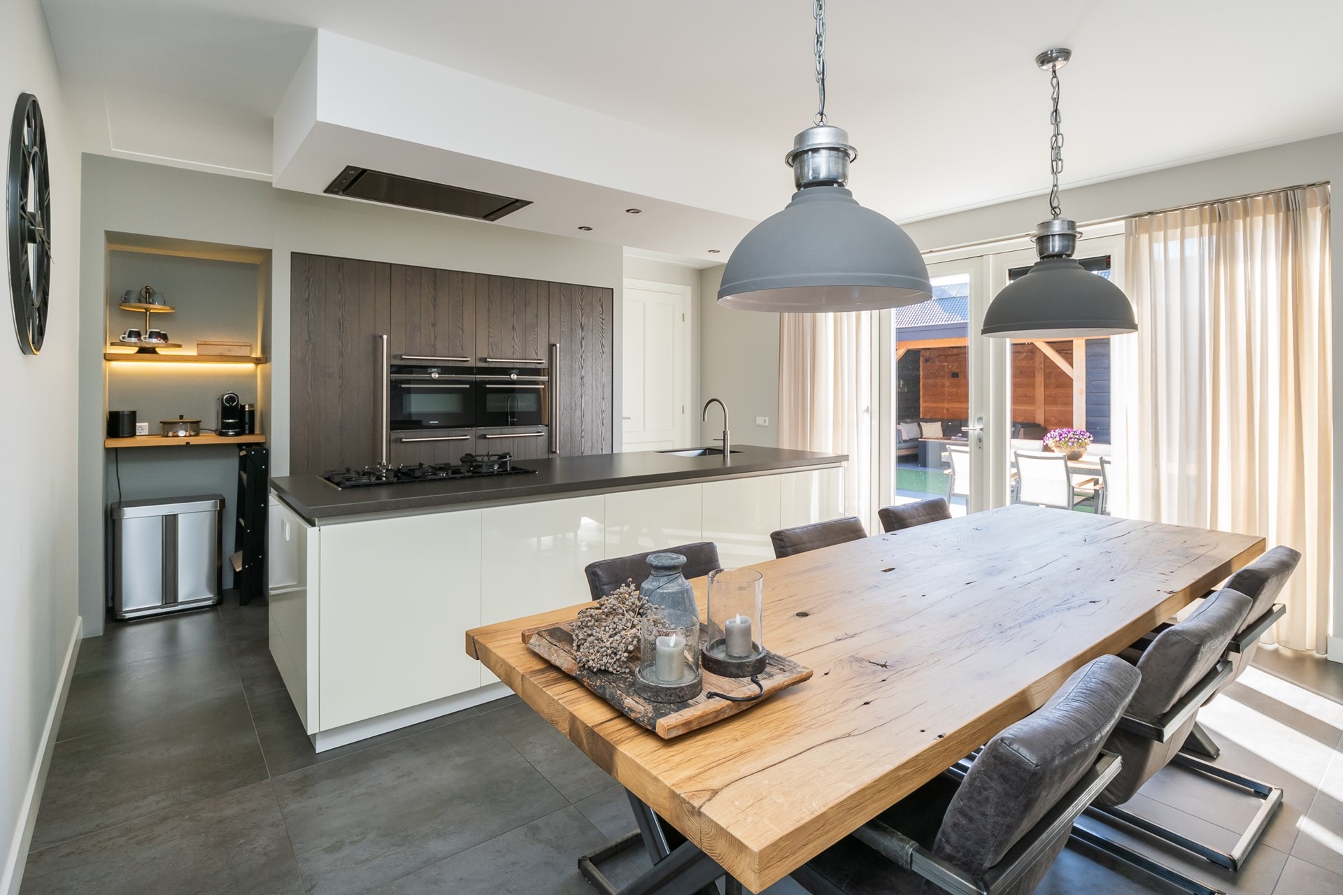 De stijlvolle steelpui met glasverdeling en openslaande deuren vormt de verbinding met de woonkeuken — het kloppend hart van de woning. Hier komen koken en tafelen vanzelf samen. Er is volop ruimte voor een grote eettafel en dankzij de brede glazen pui met openslaande deuren ervaar je een sterke connectie met de tuin. Het royale kook-/spoeleiland met natuurstenen werkblad vormt het centrale middelpunt en is uitgerust met een spoelbak, Quooker-kraan, vaatwasser, 5-pitsgaskookplaat, stopcontacten en volop opbergruimte in lades en kasten. Daarnaast is er een voorbereiding getroffen voor elektrisch koken. De strak vormgegeven plafondkoof met geïntegreerde afzuigkap en inbouwspots maakt het geheel compleet. De kastenwand biedt extra luxe en functionaliteit, met een XL koelkast, combimagnetron, combi-stoomoven en een stijlvolle koffiecorner.