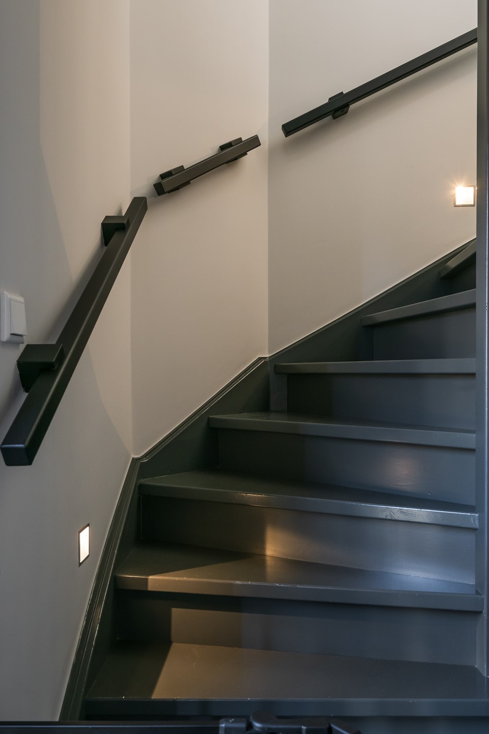 De trapopgang, subtiel verlicht met led-spots, leidt je naar de eerste verdieping. Ook hier is de hoogwaardige afwerking direct voelbaar. Op de vloer ligt eikenlook laminaat in extra brede delen en de wanden, plafonds en dakvlakken hebben een strakke finish, wat zorgt voor een rustige en verzorgde uitstraling.