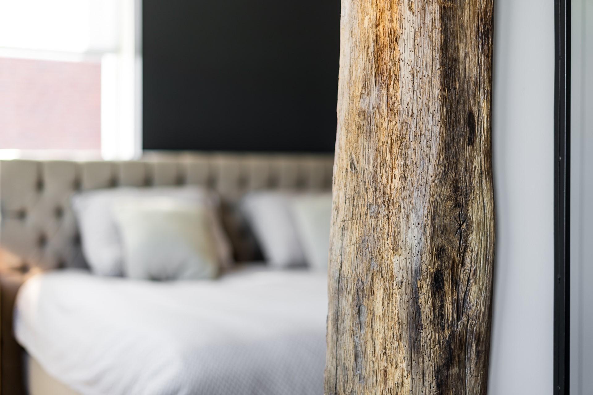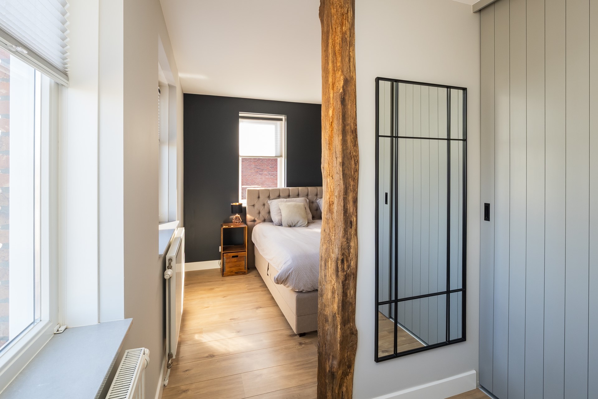De masterbedroom aan de voorzijde is ruim en elegant ingericht. Het raam biedt een vrij uitzicht door de straat en zorgt voor een prettige lichtinval. De duo-plissé gordijnen (transparant en verduisterend/zonwerend) zijn inbegrepen. Een authentieke eiken balk markeert op karaktervolle wijze de toegang tot de walk-in closet. Achter massief houten schuifdeuren vind je een praktische en overzichtelijke kasteninrichting met hang-, leg- en ladegedeelten.