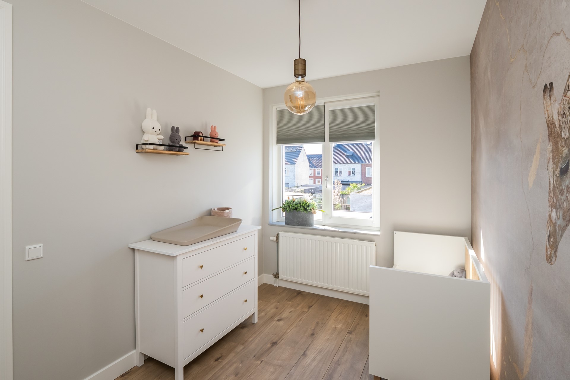 Aan de achterzijde bevinden zich de tweede en derde slaapkamer, ieder met een eigen sfeer en een fijn uitzicht over de woonomgeving. De plissé gordijnen zijn inbegrepen en de op afstand bedienbare rolluiken zorgen voor extra comfort. Een speels en onderscheidend detail is de stijlvolle behangwand met giraffeprint.
