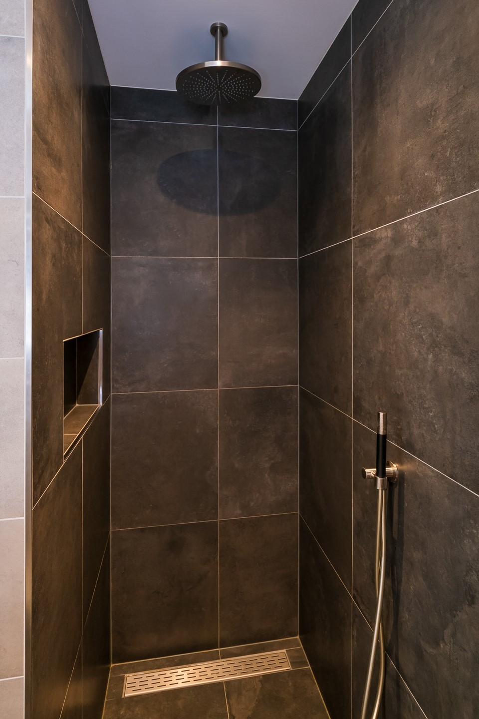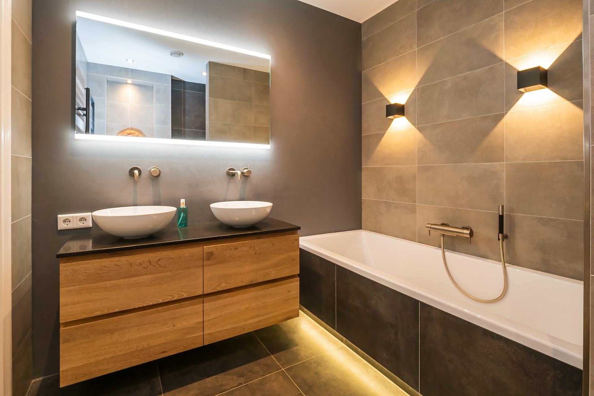 De badkamer is een plek waar comfort en luxe samenkomen. Uitgevoerd met hoogwaardig sanitair van “Hotbath”, doordachte verlichting en een praktische indeling die uitnodigt tot ontspanning. Begin de dag onder de regendouche of kom tot rust in het ligbad met watervalkraan. De geïntegreerde nissen voor de badproducten zorgen voor extra gemak. Het eiken duo-wastafelmeubel met hardstenen blad, waskommen en designkranen uit de wand vormt een echte blikvanger. De bijbehorende spiegel is voorzien van ledverlichting en spiegelverwarming. Het wandcloset maakt het sanitair compleet. De designradiator zorgt voor een aangename temperatuur, terwijl de doorgeluste verwarmingsleidingen onder de vloer bijdragen aan een comfortabel gevoel. De mechanische ventilatie zorgt voor een frisse atmosfeer.