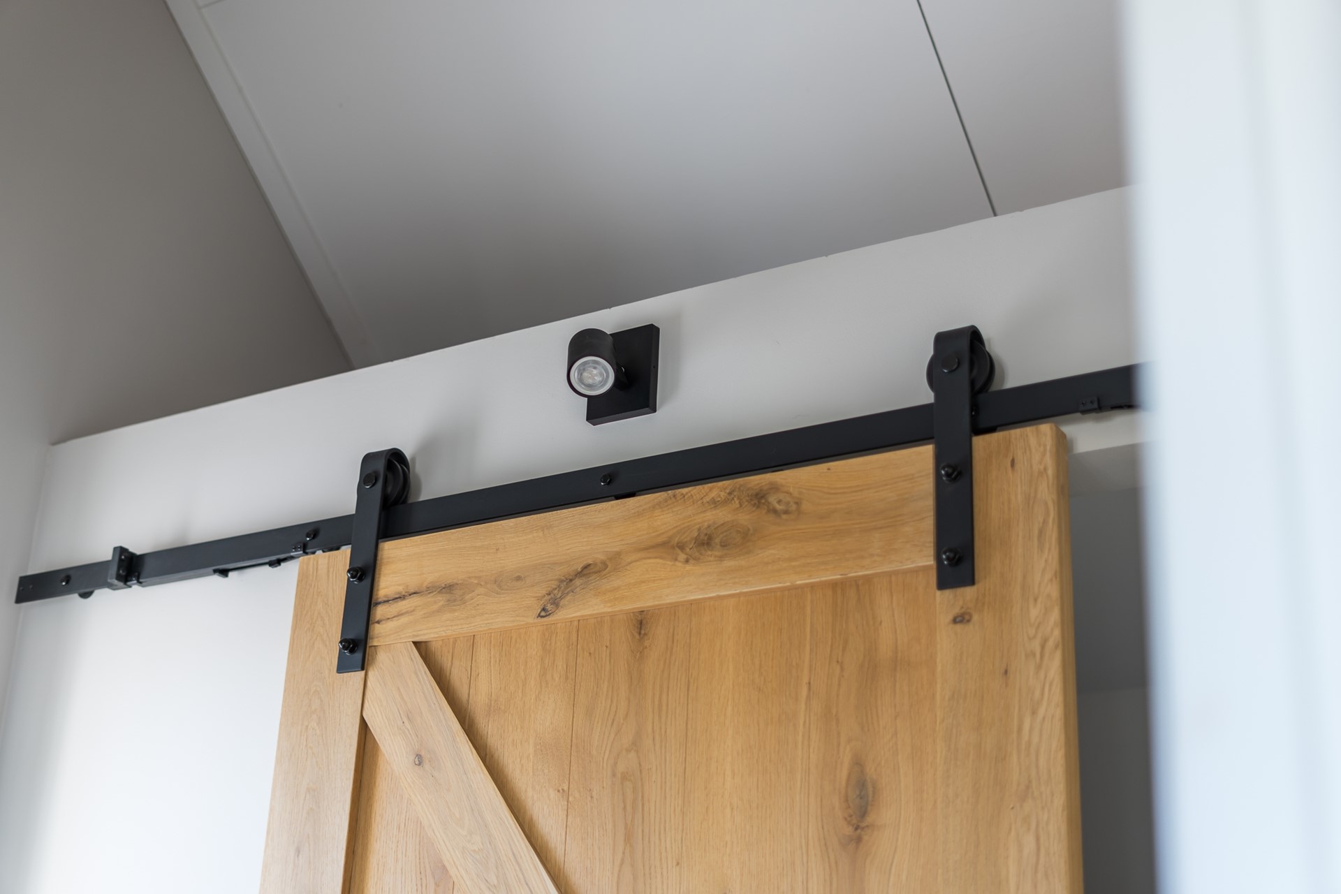 De vaste trapopgang leid je naar de tweede verdieping. De airconditioner is strategisch geplaatst, zodat deze zowel de eerste als de tweede verdieping van een aangenaam klimaat voorziet. Bovenaan de trap opent een eiken schuifdeur met industrieel beslag naar de overloop. Ook hier is de stijlvolle afwerking doorgevoerd: De overloop voelt ruim en licht aan dankzij de dakkapel en het zijraam. Je vindt hier de aansluitingen voor de wasmachine en droger, de CV-installatie en de unit van de mechanische ventilatie met WTW-systeem. Via een losse houten trap is bovendien de praktische bergzolder bereikbaar.