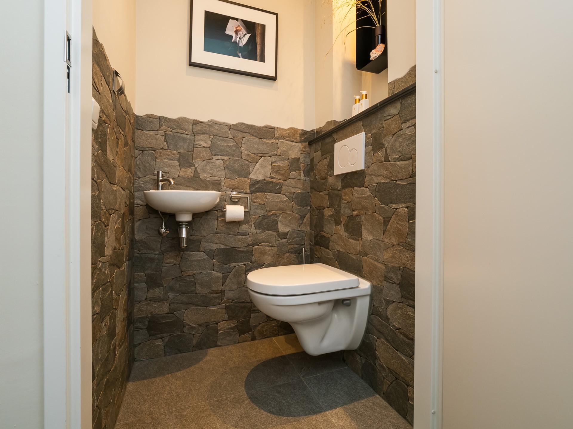 Zodra je via de overdekte entree de hal binnenstapt, voel je het. Dit is thuiskomen! De vloer heeft vloerverwarming en is uitgevoerd met groot formaat plavuizen. De wanden en het plafond zijn glad gestuct. Let ook op de mooie natureltint op de wanden en de kaderlijst langs het plafond. Deze smaakvolle styling ademt door op de gehele begane grond. Je vindt in deze hal de toiletruimte en de meterkast. De mooi verzorgde toiletruimte is uitgevoerd met een wandcloset, fontein en een leuke nis met spotverlichting.