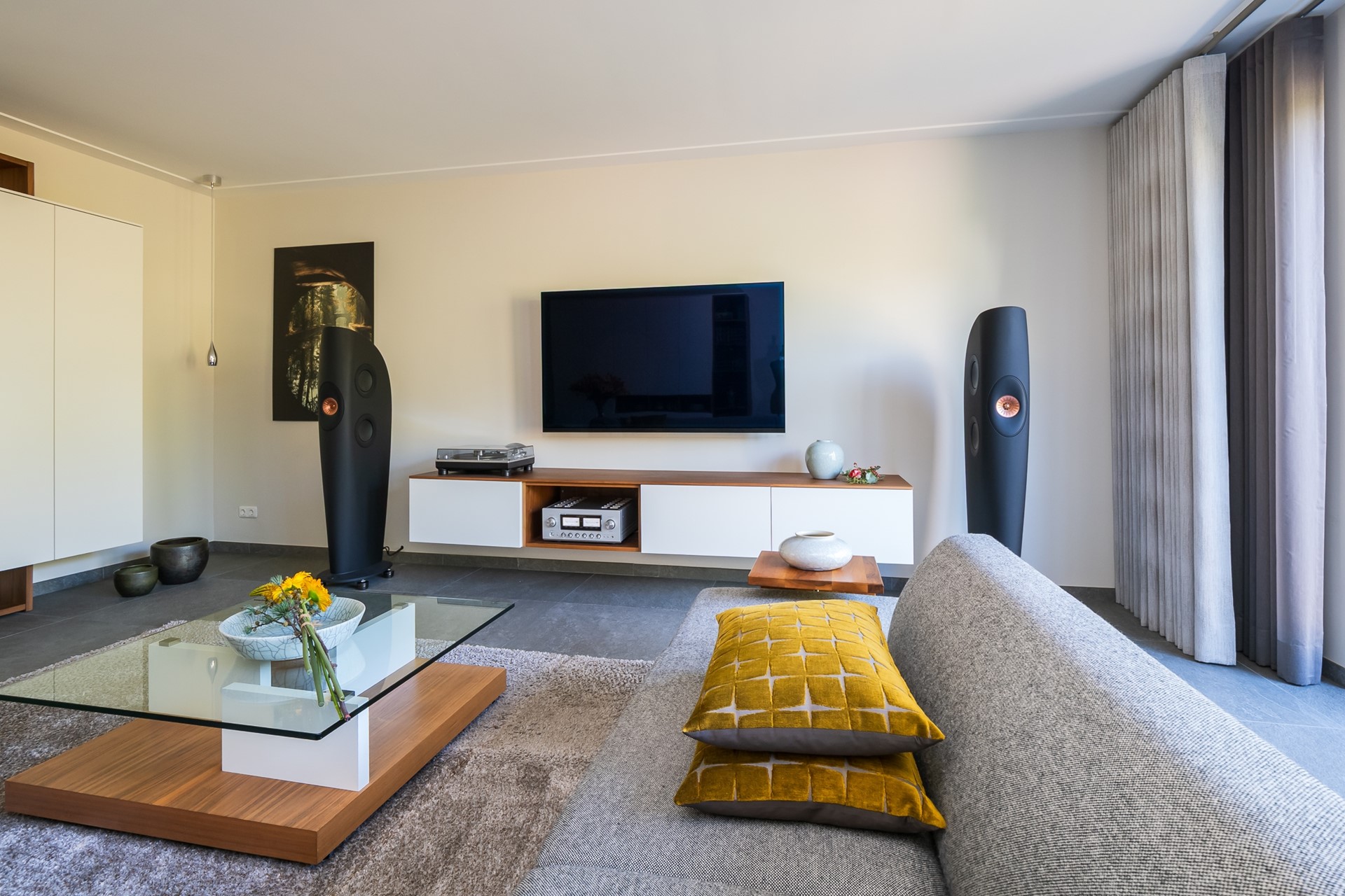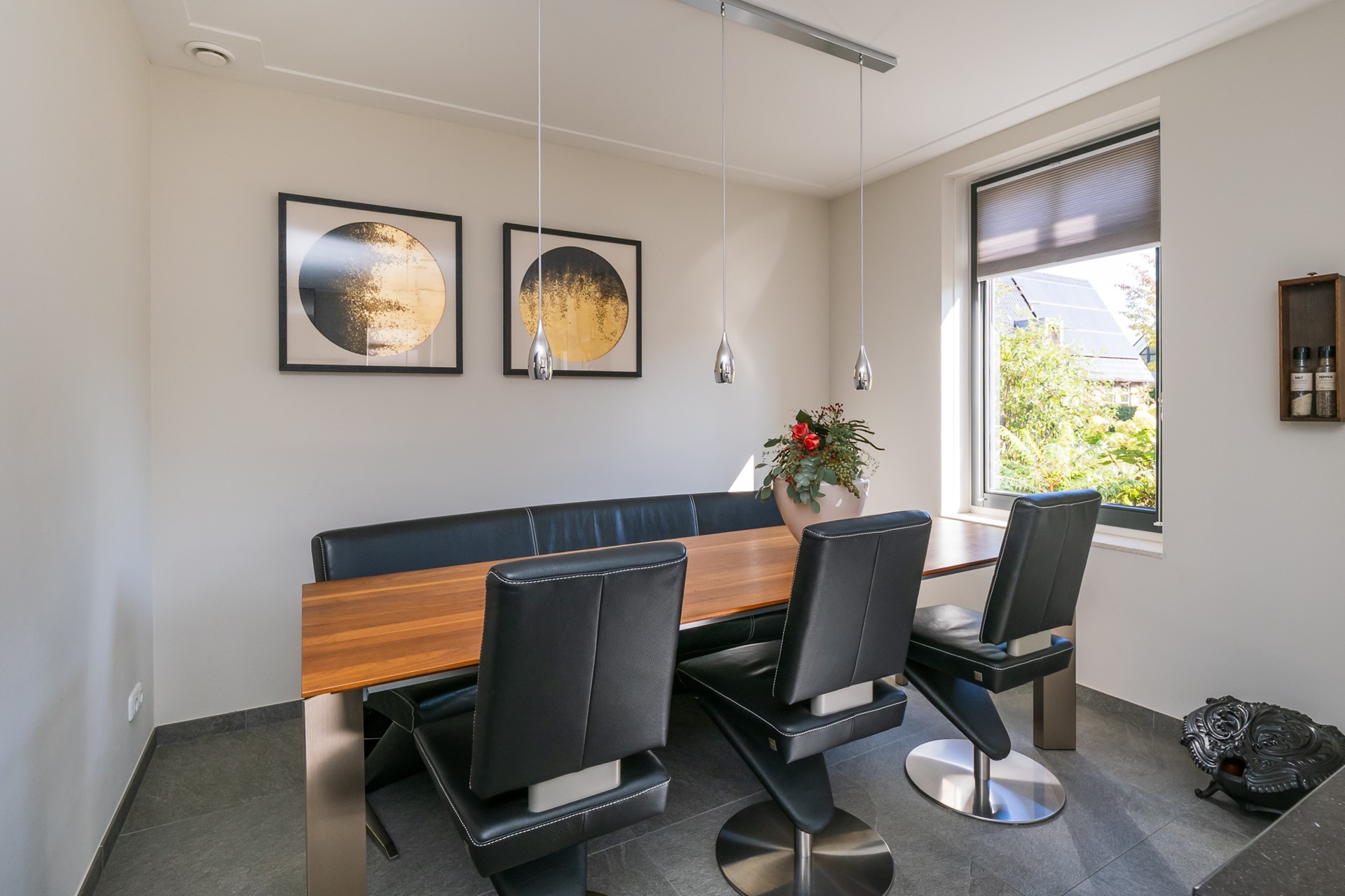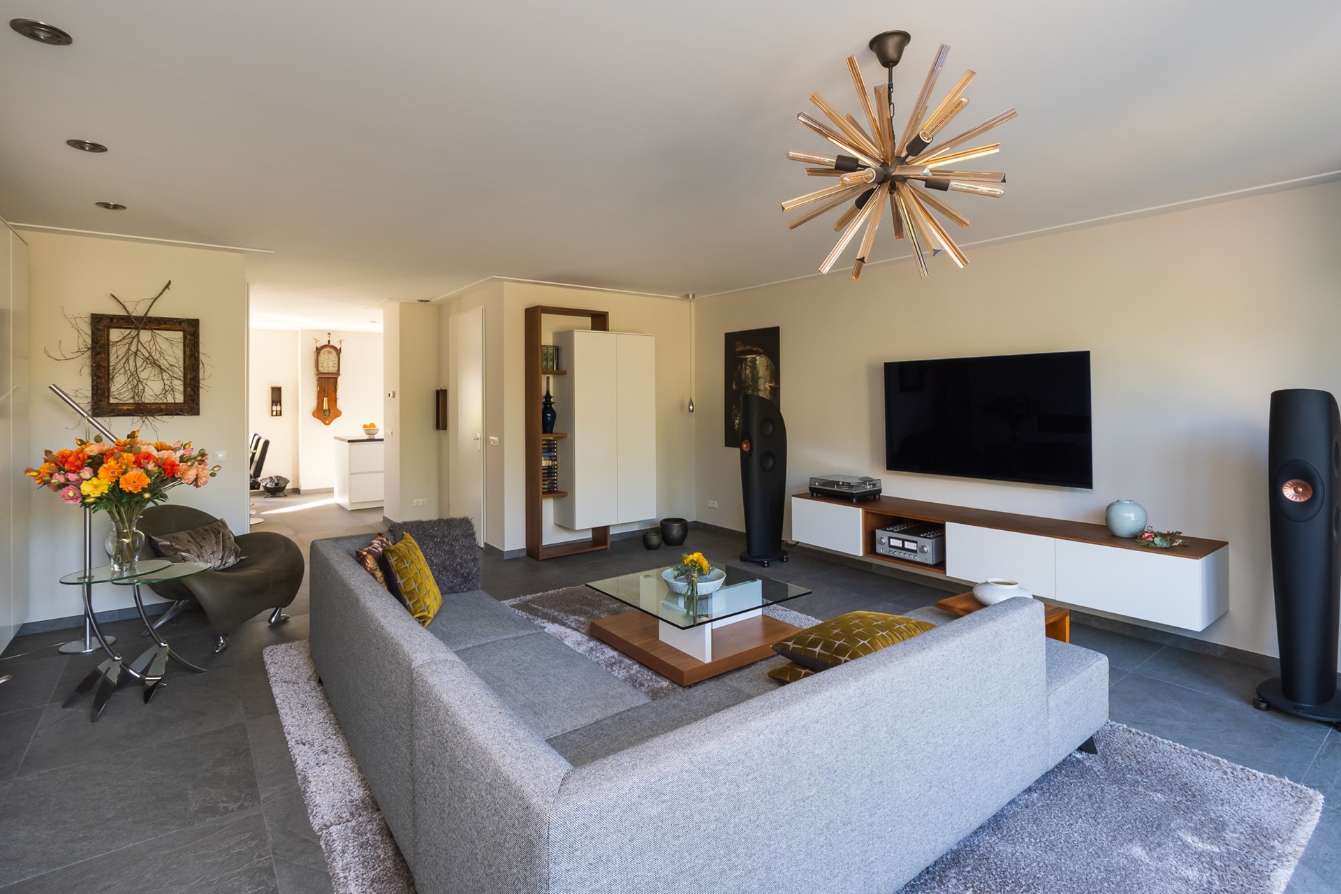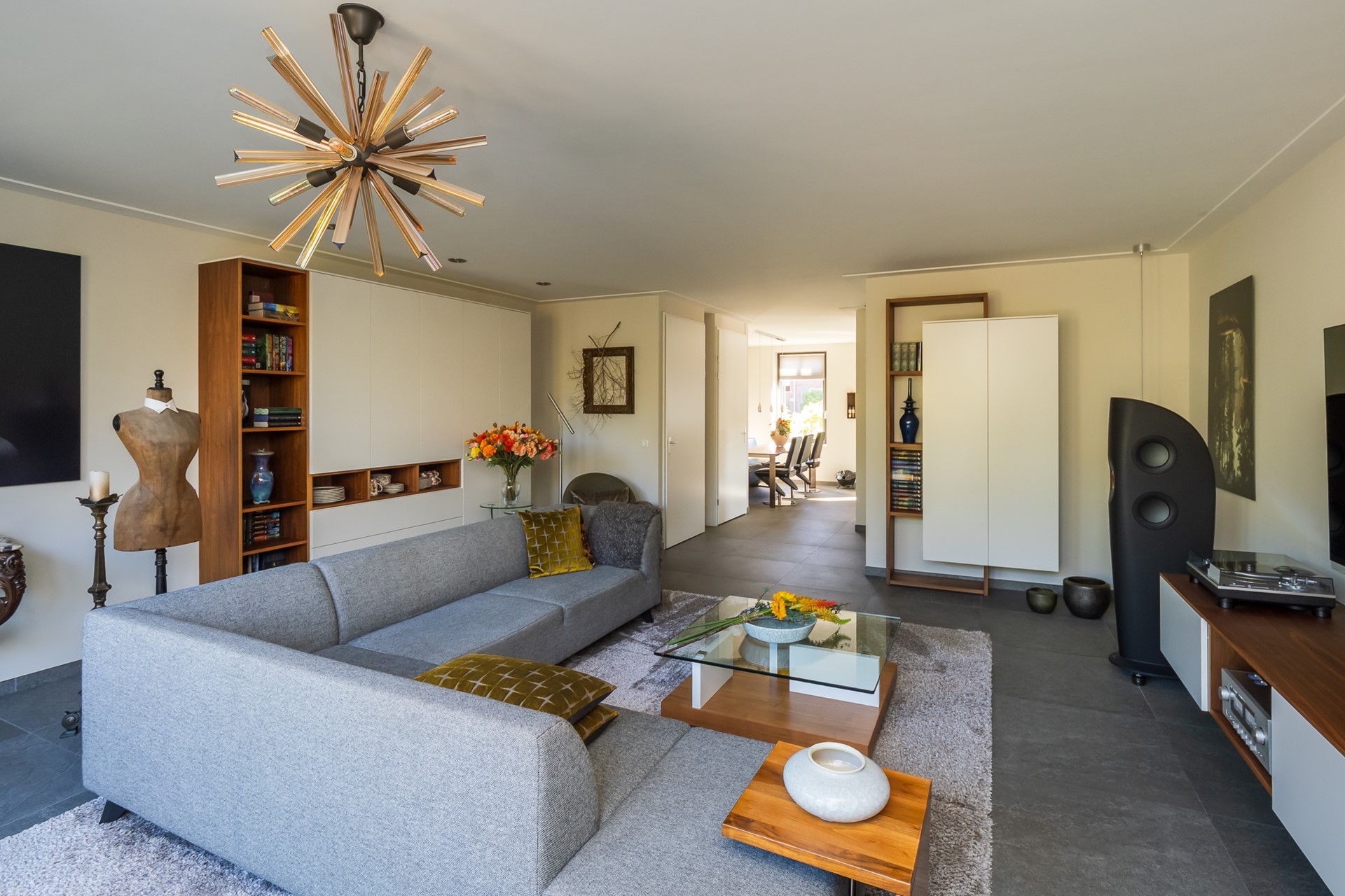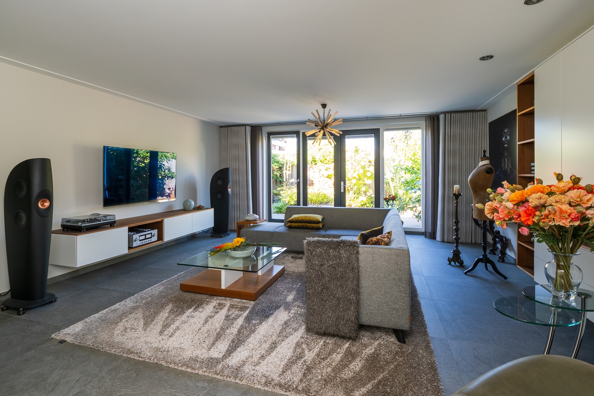 De imposante living is door de uitbouw nog royaler geworden en nodigt uit tot gezellig samenzijn. De brede glaspui met openslaande deuren zorgt voor een dynamische verbinding met de loungetuin. Overdag valt het licht royaal binnen en ’s avonds voorziet het speelse lichtplan in de juiste sfeer. De dubbele wavegordijnen, deels inbetween en deels verduisterend, zijn stijlvol en praktisch - deze zijn ter overname.