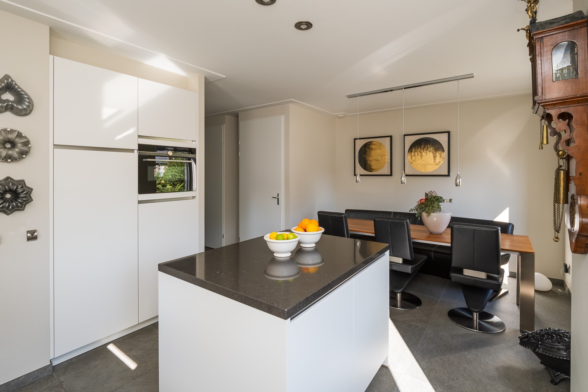 Aan de voorzijde ligt de woonkeuken; een plek waar koken, eten en genieten vloeiend samengaan. De kwalitatieve keukenopstelling bestaat uit een wandopstelling met kastenwand en een vrijstaand eiland. De mat witte kastenfronten in combinatie met de composiet werkbladen en de "Siemens Studioline" apparatuur vormt een hoogwaardig geheel. De apparatuur bestaat uit een inductiekookplaat, afzuigschouw, combi-oven, vaatwasmachine, koelkast, vrieskast en een “Franke” kokend waterkraan. Dankzij het royale vloeroppervlak is er bovendien volop ruimte om een royale eethoek te plaatsen voor een gezellige maaltijd met het gezin of diners met vrienden.