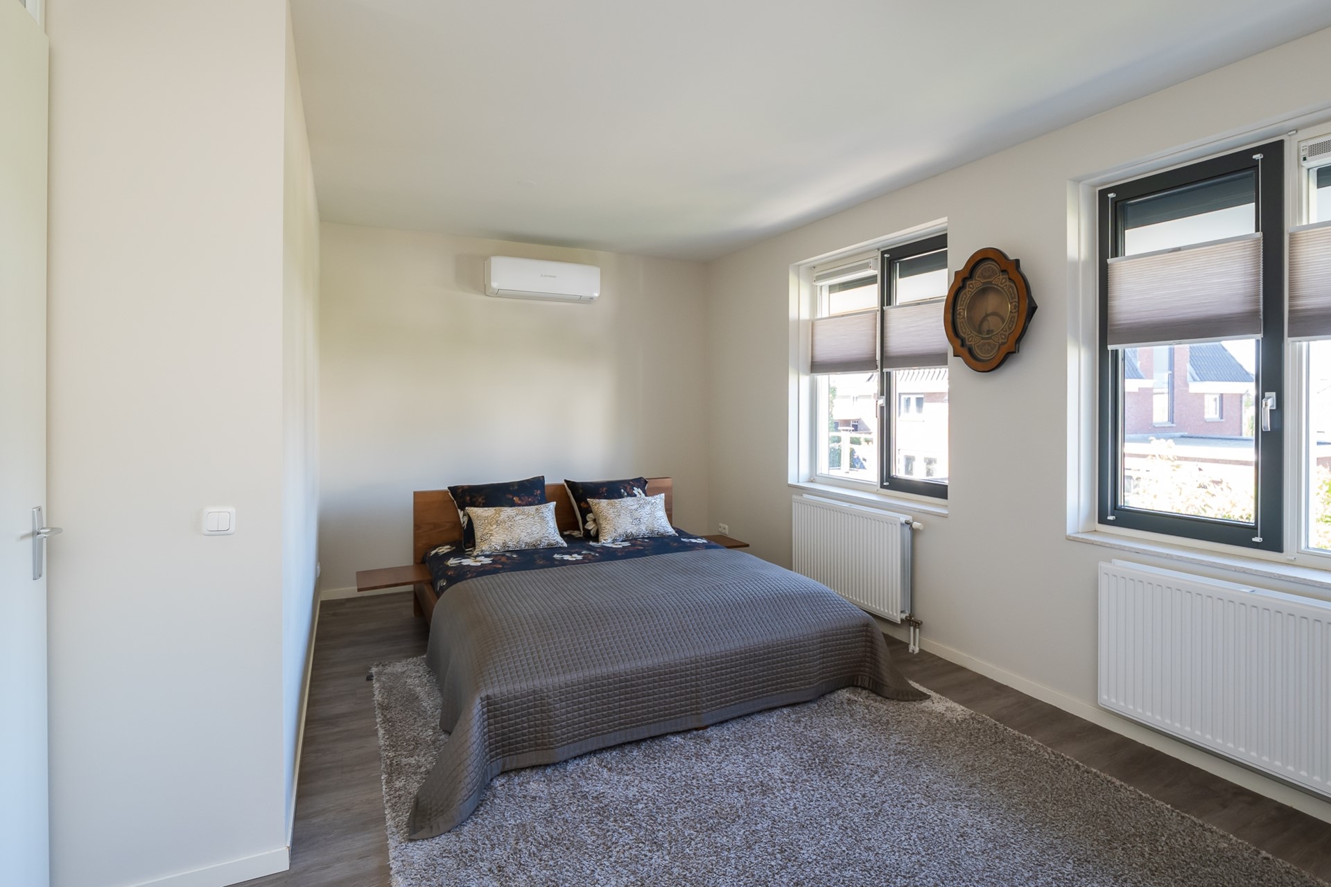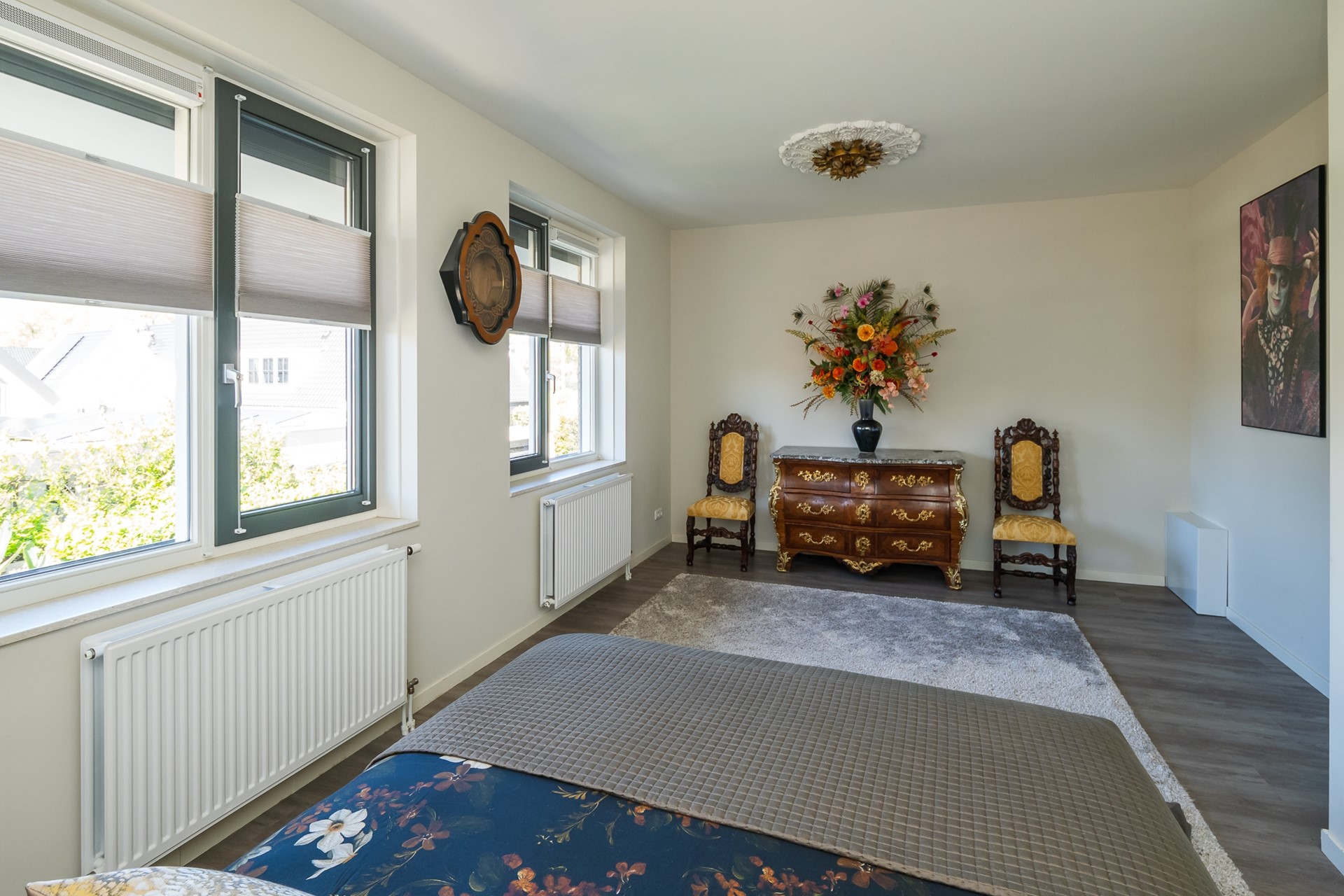 Aangrenzend ligt een zeer royale slaapkamer, die zich wederom over de volledige breedte van het huis uitstrekt. De huidige bewoners hebben deze ruimte aanzienlijk vergroot met een dakkapel van kunststof. Hierdoor baadt de kamer in daglicht en ontvouwt zich een panoramisch uitzicht over de prachtige omgeving. Dankzij de duo-plisségordijnen - transparant en verduisterend - creëer je moeiteloos de gewenste sfeer. In de zijgevel bevindt zich nog een raam, dat is uitgevoerd met een plisségordijn en een elektrisch bedienbaar rolluik.De “Mini Rooftop” airconditioner zorgt tenslotte voor een aangenaam binnenklimaat, het hele jaar door.