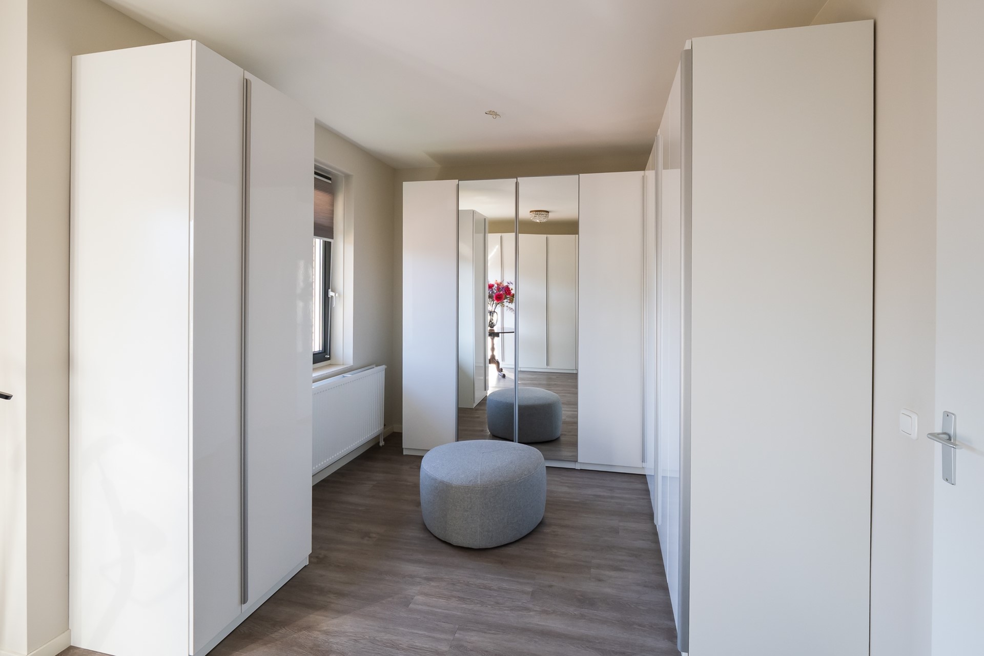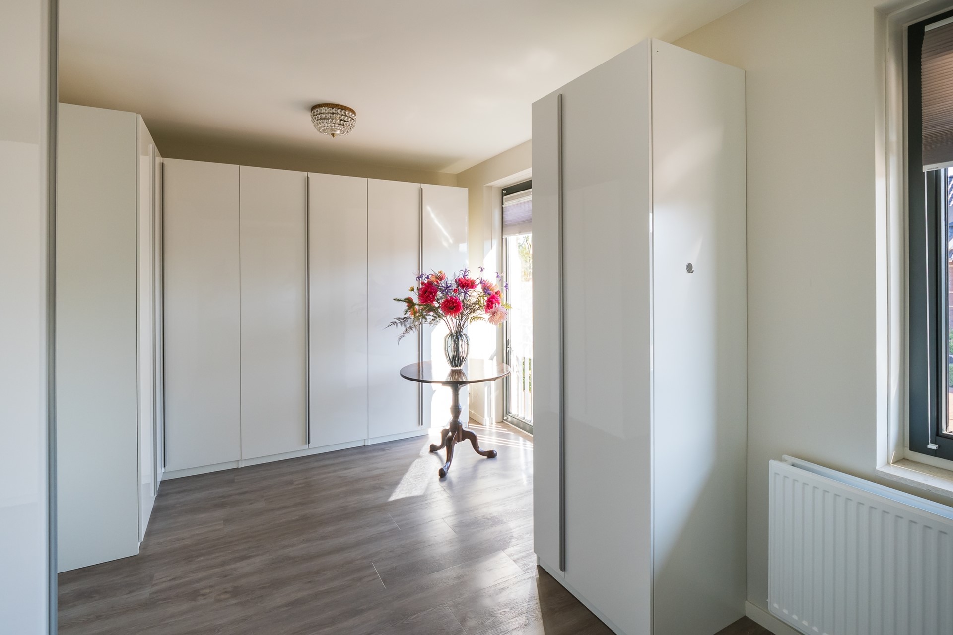 De royale garderobekamer kenmerkt zich door praktisch gemak en uitstraling. De strak vormgegeven hoogglans kasten bieden volop ruimte voor je garderobe, waardoor alles zijn eigen plek krijgt en overzicht bewaard blijft - deze kasten zijn ter overname. Terwijl je hier ’s ochtends je outfit samenstelt, valt het daglicht rijkelijk naar binnen via het aanwezige raam en de Franse balkondeuren. Ook hier zijn de plissé-gordijnen en de elektrische rolluiken niet vergeten.