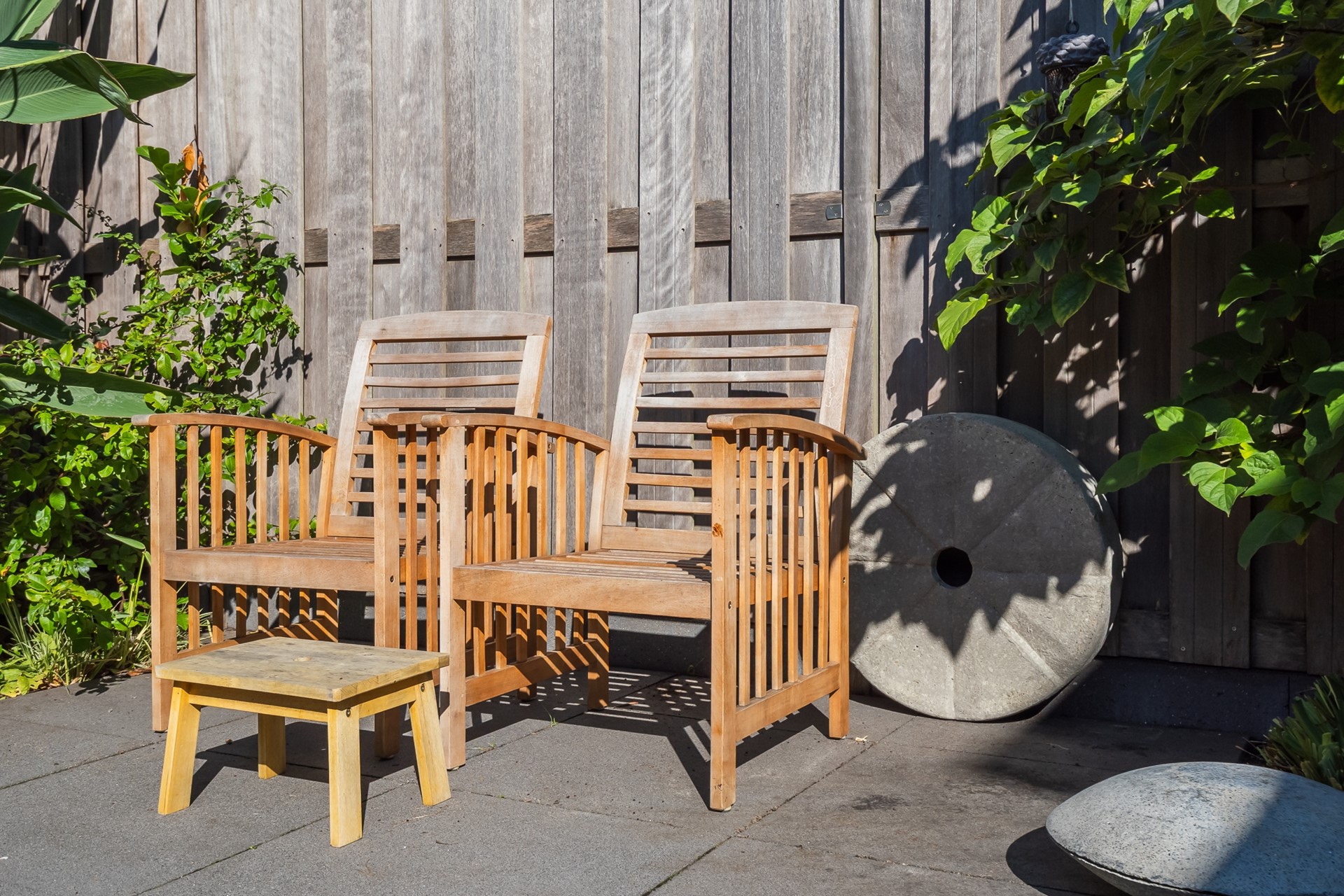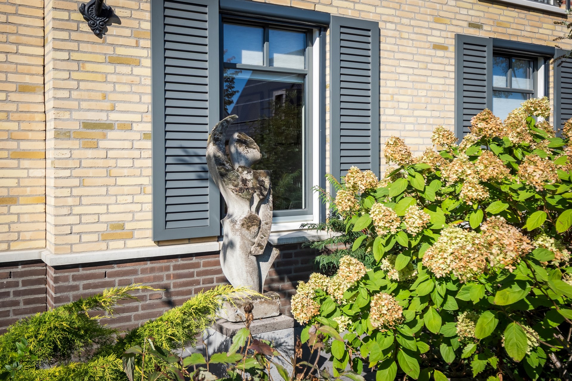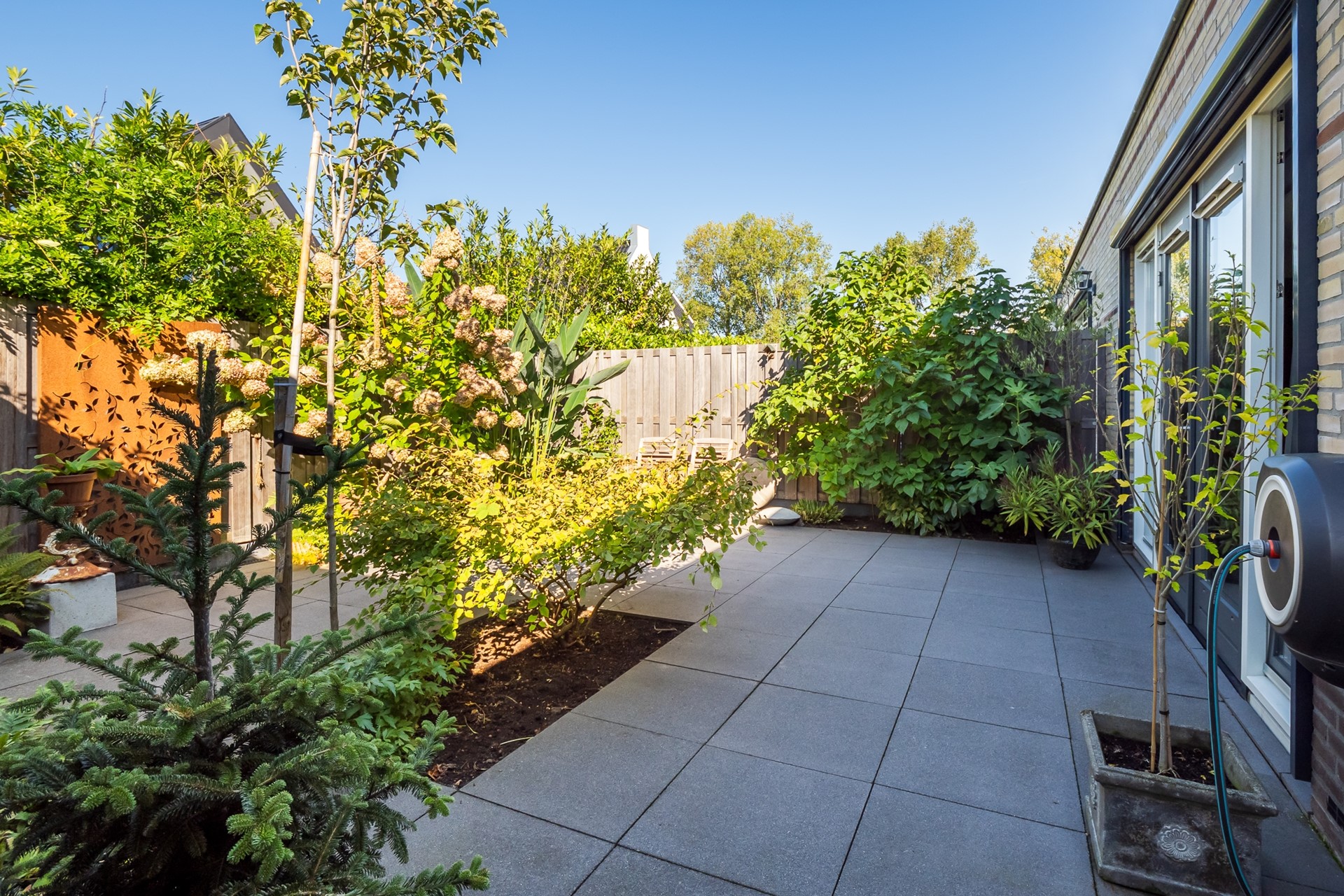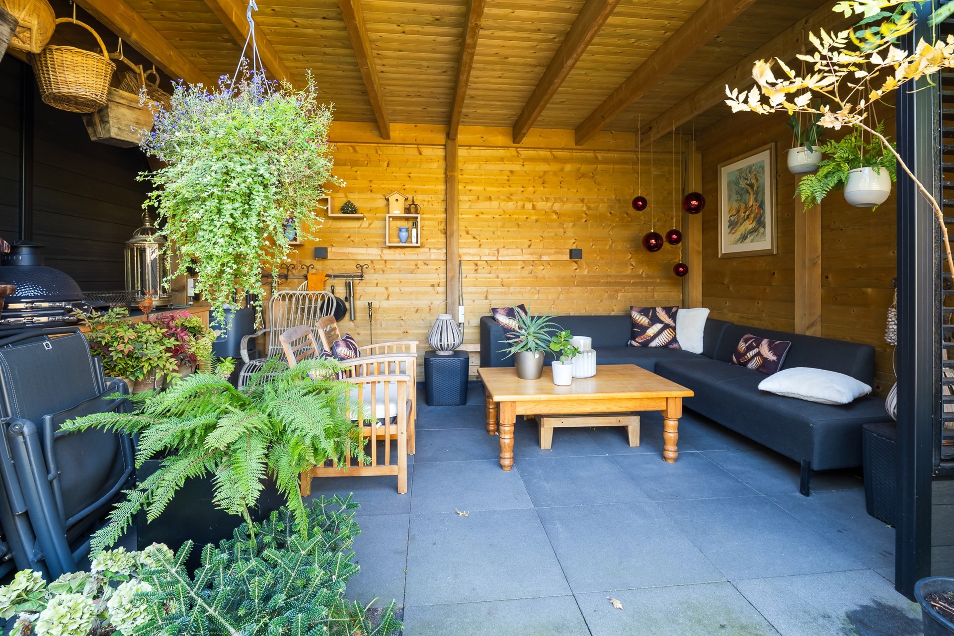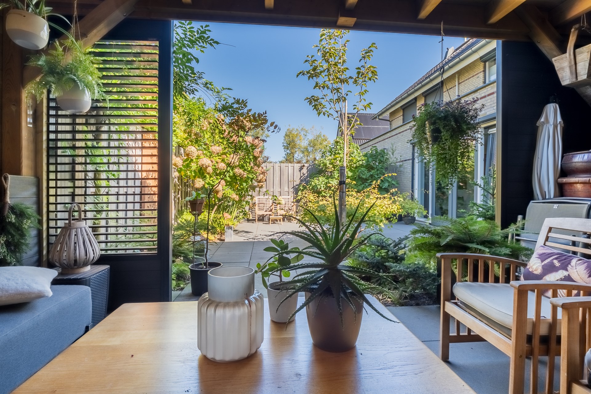 Achter de woning ligt de loungetuin die privacy, rust en groenbeleving moeiteloos combineert. De basis van groot formaat tegels is strak en modern, terwijl de speels ingerichte borders – rijk aan kleur en variatie – de tuin een levendige uitstraling geven. De veranda uit 2020 is het sfeervolle hart van dit buitenleven. De oriëntatie en het natuurlijke materiaalgebruik creëren een serene sfeer, waarin je vanzelf tot rust komt. Overdag zorgen shutters voor extra beschutting en 's avonds creëert de wandverlichting een sfeervolle ambiance. Dankzij de aanwezige stopcontacten is er volop ruimte voor extra comfort: denk aan een terrasverwarmer, buitenkeuken of andere elektrische gemakken. Kortom, hier beleef het buitenleven op zijn best; een plek waar je alle seizoenen profijt van hebt.